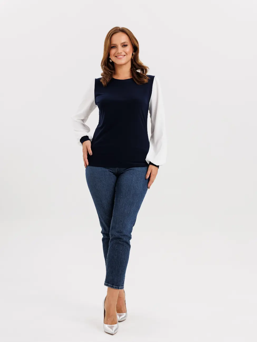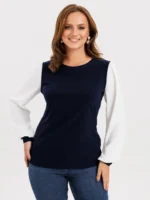 Красивый трикотажный джемпер с текстильными рукавами станет отличной базой Вашего офисного гардероба. Модель имеет полуприлегающий силуэт, что делает ее удобной для женщин любого телосложения. Джемпер выполнен с длинными белыми рукавами, которые придают образу легкость и романтичность. Рукав дополнен манжетой из основного полотна высотой 4 см. Данный джемпер прекрасно сочетается как с брюками, так и с юбкой.