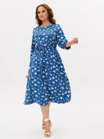 Нарядное платье длины миди из струящейся ткани. В талии предусмотрена резинка, которая подчеркивает женственный силуэт. Широкая юбка полусолнце плавно расширяется внизу, обеспечивая изящный внешний вид и свободу движений. Рукава длиной три четверти имеют объемный крой и мягкие резинки на манжетах. Такое платье подходит как для повседневных прогулок или офиса, так и для торжественных случаев.