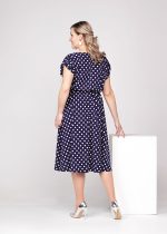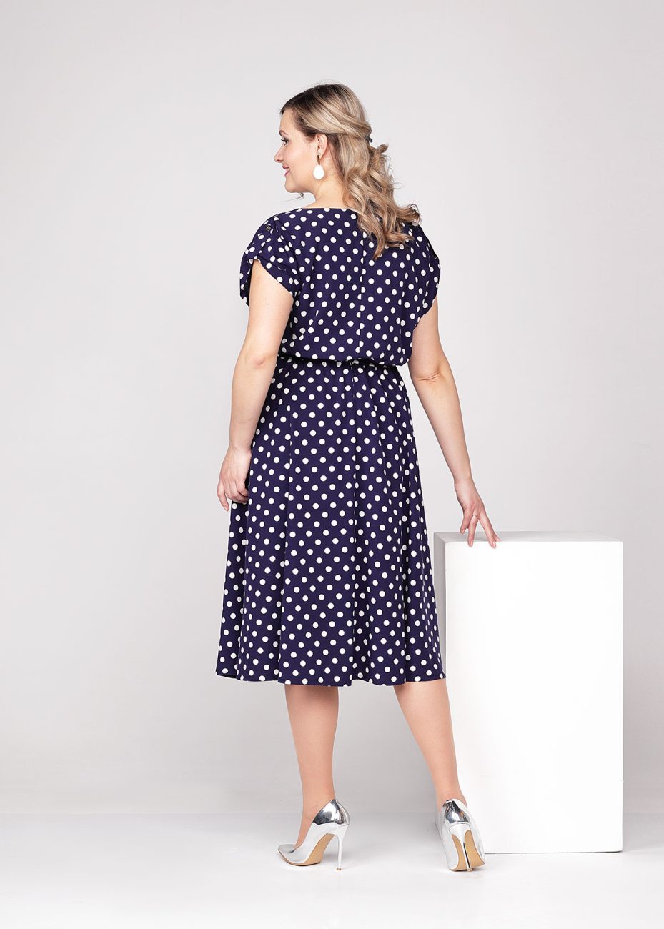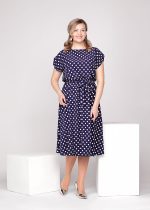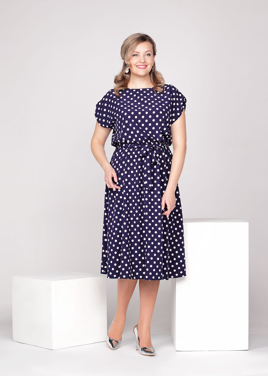 Легкое летнее женское платье, выполненное из высококачественной смесовой ткани. Верхняя часть имеет свободный силуэт и спущенное плечо. На рукаве пришита отделочная пата с декоративной пуговицей. По талии вставлена резинка и декоративный съемный пояс. Роскошная юбка-полусолнце придает платью романтический стиль.