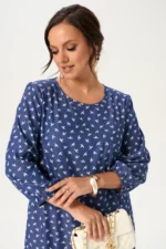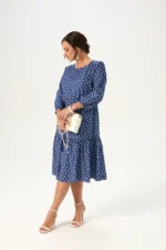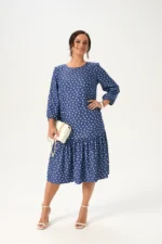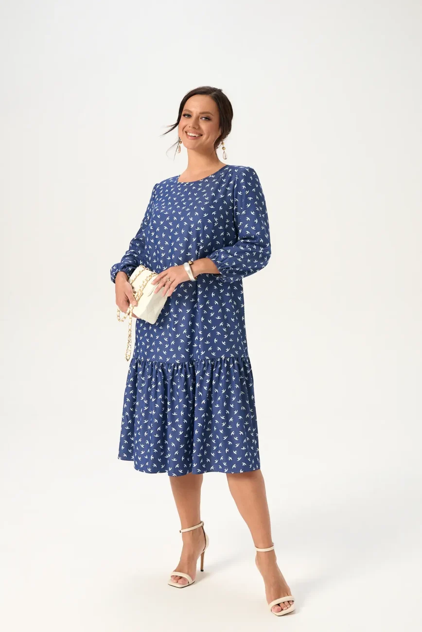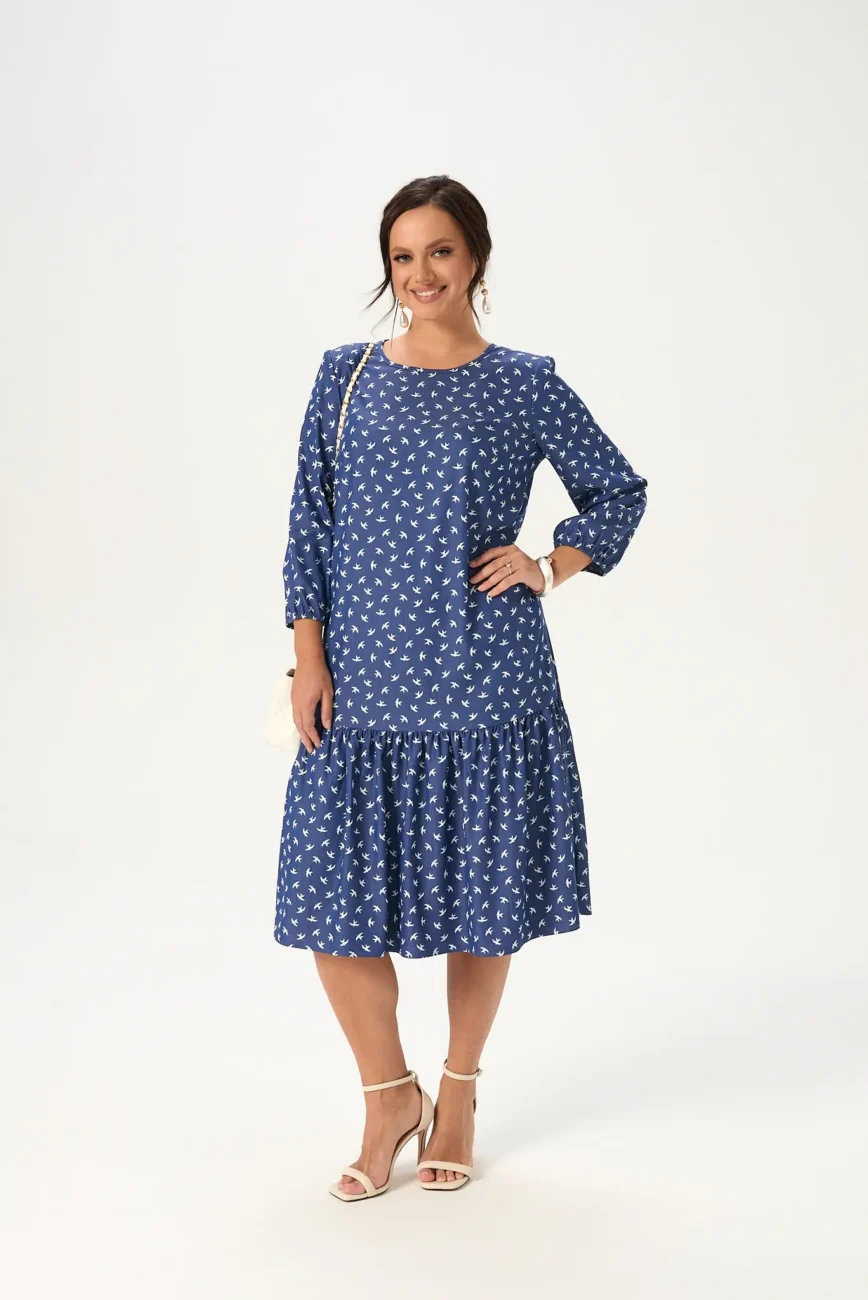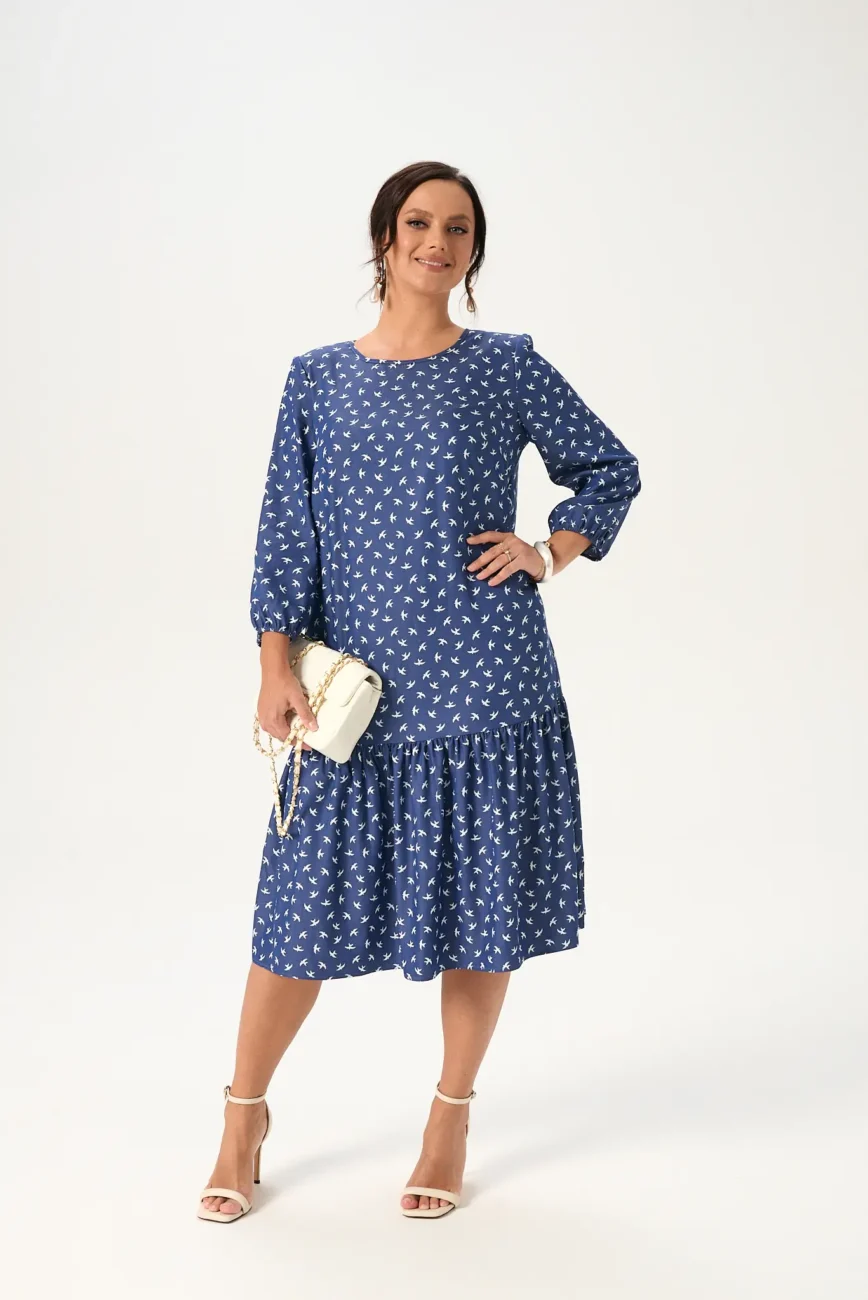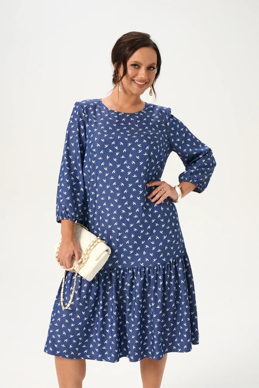 Красивое женское платье А-силуэта с большим содержанием вискозы будет отличным выбором для женщины, которая хочет выглядеть актуально без лишних усилий! Удобная длина миди и рукав три четверти на резинке обеспечит комфорт в течение дня. Горловина изделия округлой формы, сзади застегивается на пуговицу. Платье красиво садится по фигуре, не стесняя движений. Дизайнерский принт делает образ легким и запоминающимся.
