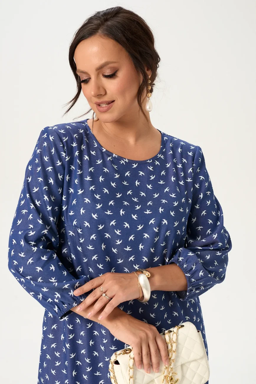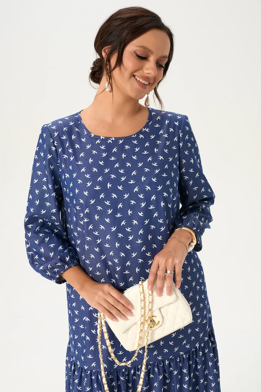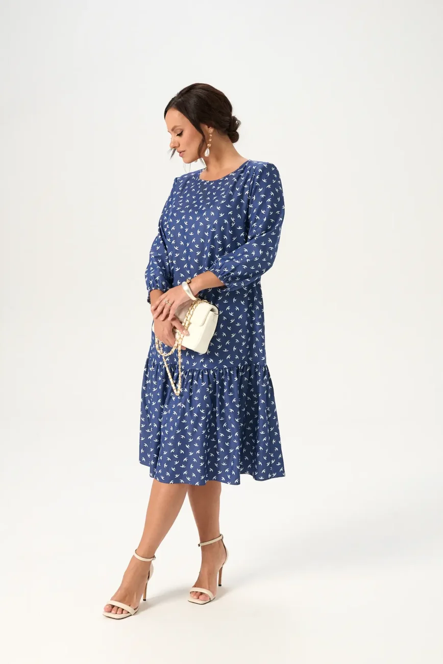 Платье женское модель 125 белые ласточки на джинсовом фоне