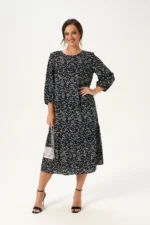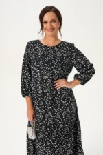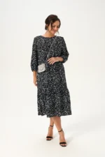 Платье А-силуэта с двумя воланами придаст Вашему образу воздушность и романтичность, а эффектный принт акварель добавит яркости. Свободный силуэт подходит для любой фигуры, скрывает недостатки и подчеркивает достоинства. Длина миди делает это платье универсальным как для повседневной носки, так и для особых случаев. Втачной рукав три четверти позволит Вам свободно носить аксессуары, а состав вискоза 100% гарантирует комфорт и легкость в жаркие летние дни.