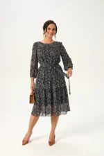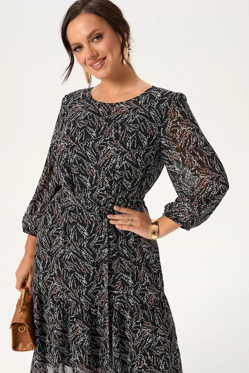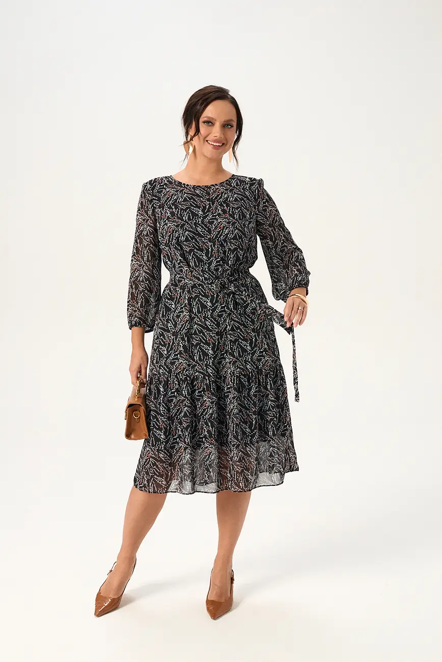 Платье-трапеция из воздушного креп-шифона станет отличным выбором для весны и лета! Изделие имеет свободный крой, поэтому подойдет для разных типов фигуры и будет легко комбинироваться с обувью на каблуках или плоской подошве, в зависимости от Вашего настроения. В плечевые швы вставлена качественная трикотажная подкладка. Втачной рукав ¾ на резинке подчеркивает красоту запястья и позволяет свободно носить различные аксессуары. При желании талию можно подчеркнуть поясом, выполненным из основной ткани. Длина миди сочетает в себе удобство и элегантность, а нежный принт веточки добавит образу женственность и романтичность